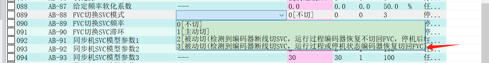 3---被动切(检测到编码器断线切SVC,运行过程或停机状态编码器恢复切回FVC)。