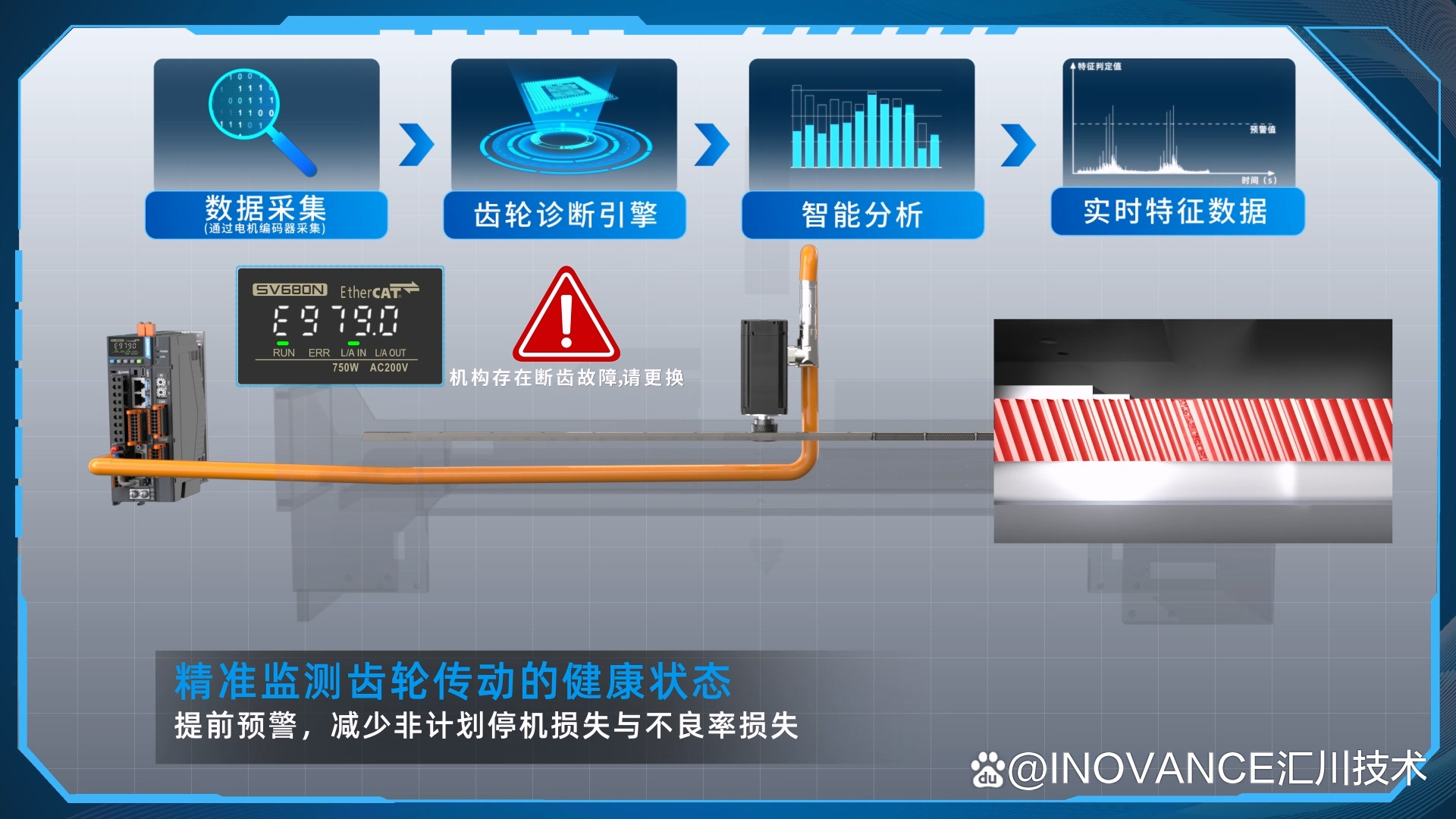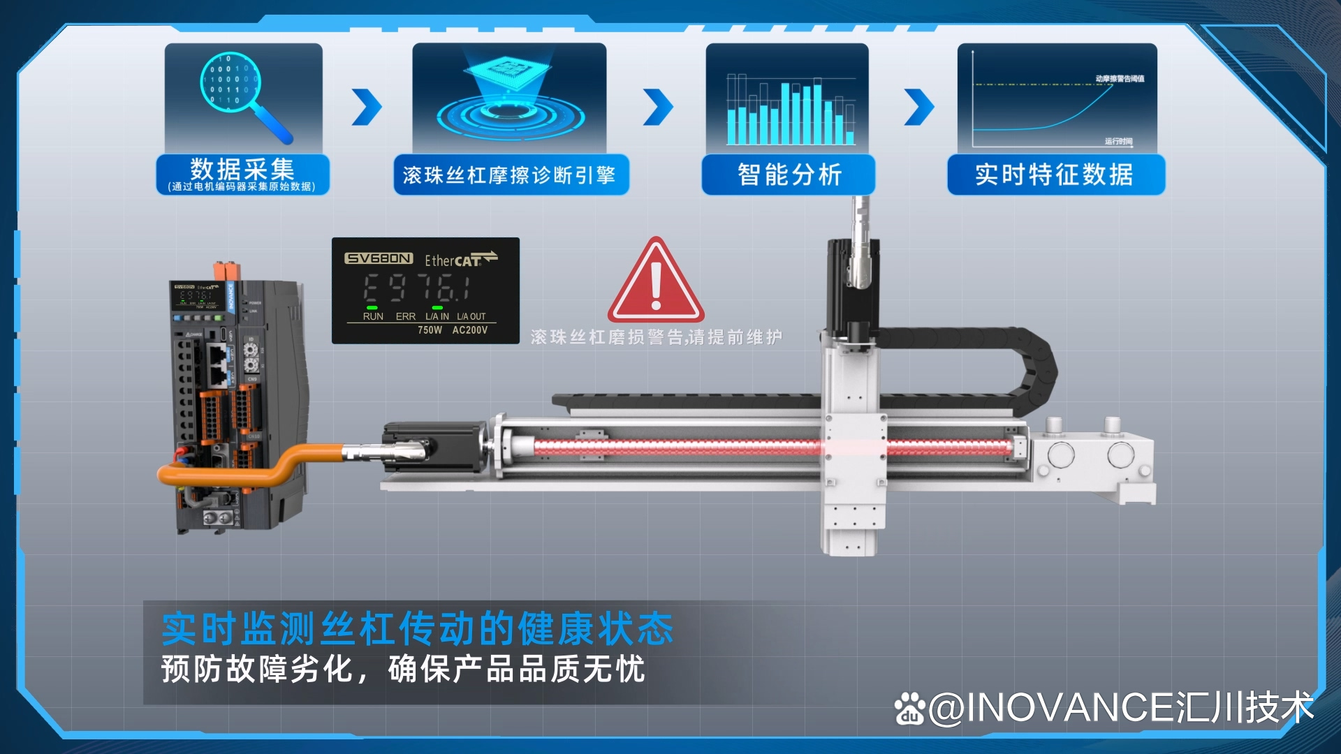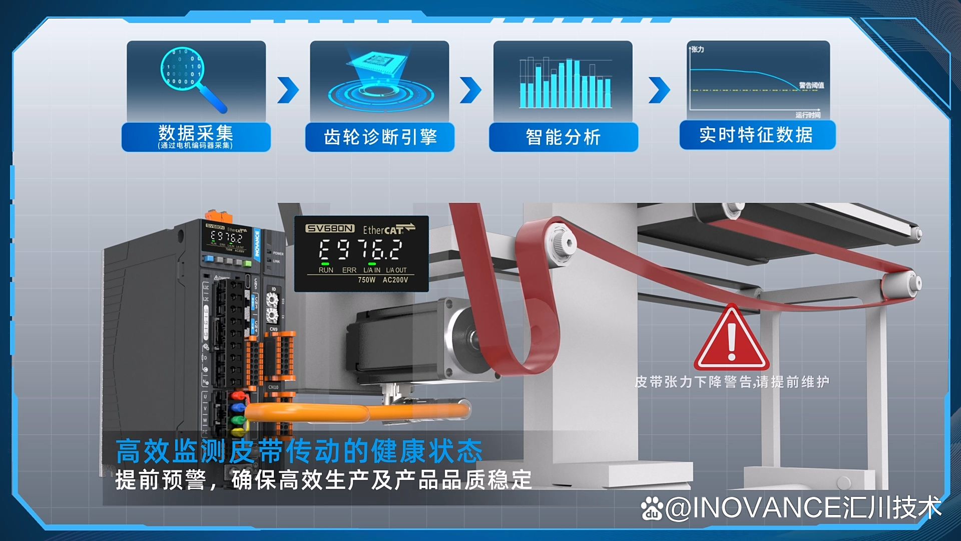 边缘层智能分析:AI伺服与汇川边缘一体机深度融合,为边缘一体机提供实时诊断的数据流,从而实现整体设备的综合健康管理,为企业的生产运营保驾护航。
