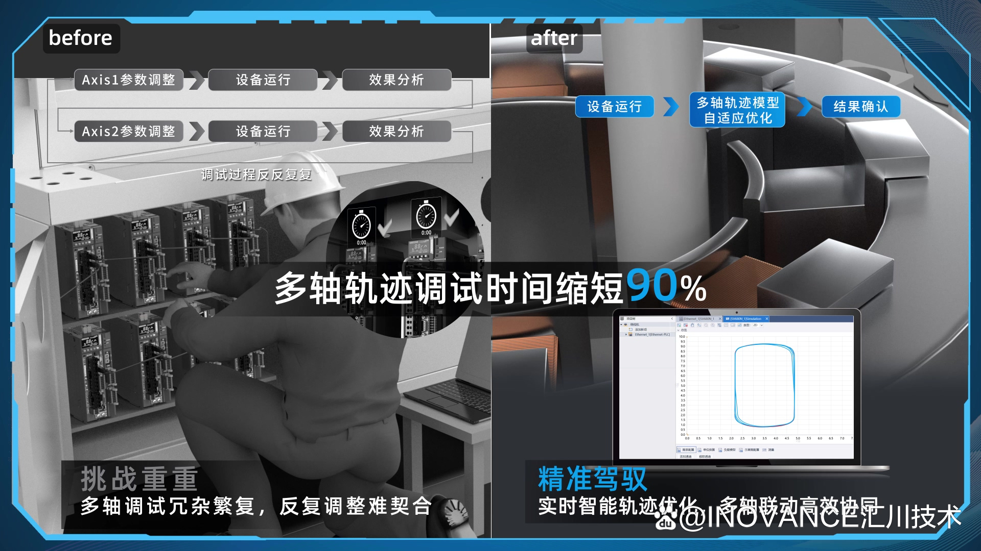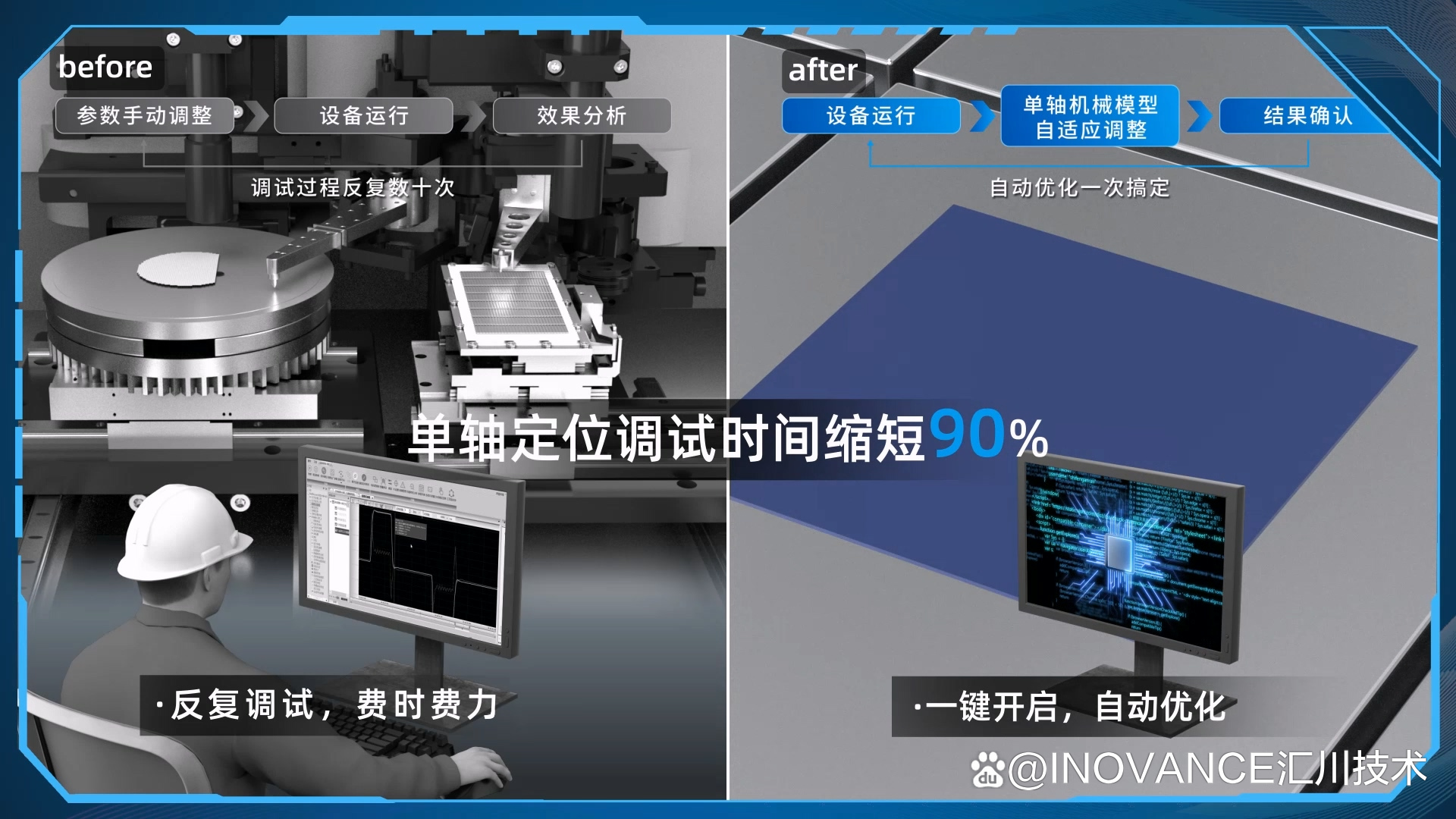一键自动调参:利用先进的算法,将原本需要调整的十几个参数简化为一个综合参数,快速匹配设备至最佳状态,调试时间的大幅缩减——高达90%!