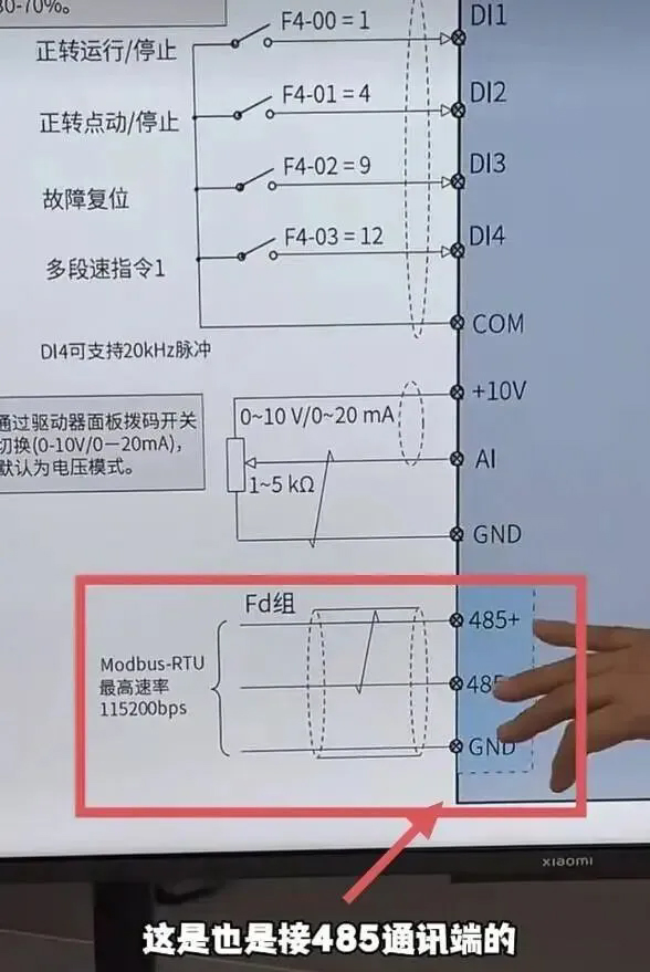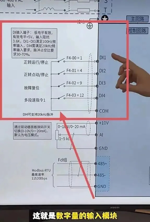 任何一个变频器都有默认设置,就是将F4-01参数调成1的时候,它的默认这个点的输入是正转运行,控制电机。这是默认使用。当默认不合适时,去面板找参数去调想用的功能。这是默认设置,是可调可更改的。(数字量输入就是控制电机运行或停止,点动或者停止)
