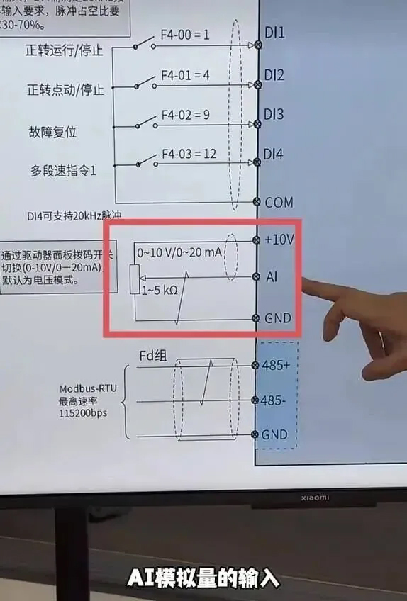 比如从PLC端,给一个模拟量的输入,来控制电机转速,快慢。(模拟量就是控制电机速度)