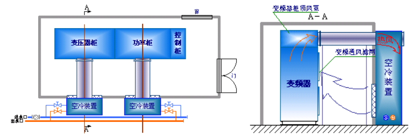 高压变频器对运行环境温度通常要求在-5~40℃,环境粉尘含量低于950ppm。过高的温度会造成变频器温度过热保护而跳闸,粉尘含量过高导致变频器通风滤网更换清洗维护量过高,增加维护费用。因此,采用何种冷却方式和系统结构至关重要。为了解决高压变频器的运行环境冷却和控制问题,提高系统安全可靠性、降低运营成本。可以解决单位散热密度高、功率大,有效提高系统安全可靠性、降低运营成本的问题。空-水冷却系统是一种利用高效、环保、节能的冷却系统,其应用技术在国内处于领先地位。在电力、钢铁等行业的高压大功率变频应用中得到广泛的推广应用。该系统由于其采用完全机械结构设计,较空调等电力、电子设备而言具有明显的安全、可靠性。其主要原理是:将变频器的热风通过风道直接通过空冷装置进行热交换,由冷却水直接将变频器散失的热量带走;经过降温的冷风排回至室内。空冷装置内通过冷水温度低于 33 ℃,即可以保证热风经过散热片后,将变频器室内的环境温度控制在 40℃以下满足变频器对环境运行的要求。从而,保证了变频器室内良好的运行环境。冷却水与循环风完全分离,水管线在变频室外与高压设备明确分离,确保高压设备室不会受到防水、绝缘破坏等安全威胁和事故。