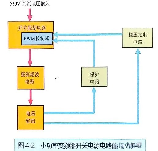 图4-3展示了小功率变频器开关电源电路中各组成电路的详细功能。其中,开关振荡电路作为核心,负责接收PWM控制器发出的矩形脉冲信号,进而驱动开关管进行导通与截止的循环,即开关振荡。这一过程导致开关变压器初级线圈中产生开关电流,使变压器进入工作状态,并在次级线圈中感应出电流。经过进一步处理后,这些感应电流被转换为所需的输出电压。