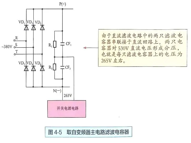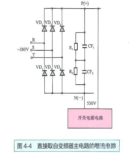 在某些小功率变频器中,开关电源电路的供电并非来自滤波电容器,而是直接从电源输入口获取。具体来说,就是从R、S、T输入端子中的任意两相上取电。