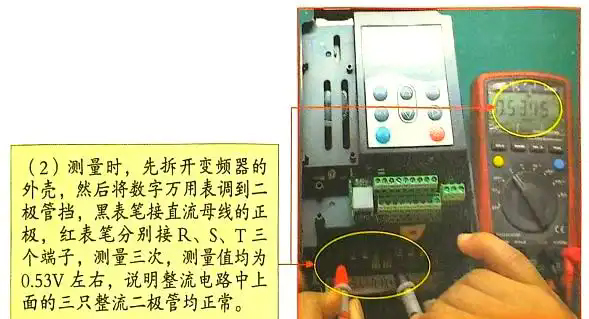 2.在测量过程中,首先需要打开变频器的外壳,随后将数字万用表调整至二极管挡位。接着,将黑表笔与直流母线的正极相连,红表笔则分别与R、S、T三个端子接触,进行三次测量。若每次测量的值均约为0.53V,则表明整流电路中上方的三只二极管均处于正常状态。