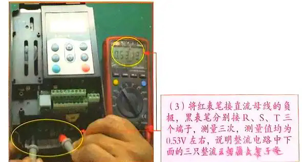 3.在完成上述测量后,将红表笔与直流母线的负极相连,随后用黑表笔分别触及R、S、T三个端子,同样进行三次测量。若每次的测量值都维持在0.53V左右,那么便可以断定整流电路中下方的三只整流二极管也都处于良好的工作状态。