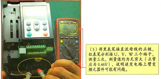 5.将黑表笔与直流母线的正极相连,随后用红表笔依次触及U、V、W三个端子,进行三次测量。若每次的测量值均显示为无穷大(而正常情况下应为0.46V),则可能表明逆变电路的上臂三只变频元器件存在故障。