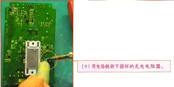 9.使用电烙铁将已损坏的充电电阻器拆下。