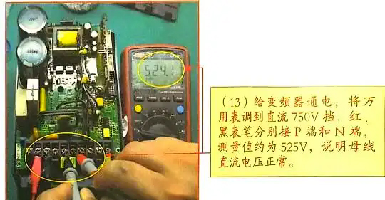 13.接下来,我们为变频器上电,并将万用表调至直流750V的挡位。随后,将红表笔与P端相连,黑表笔与N端相连,进行测量。结果显示,母线直流电压稳定在约525V,这进一步确认了母线直流电压处于正常状态。