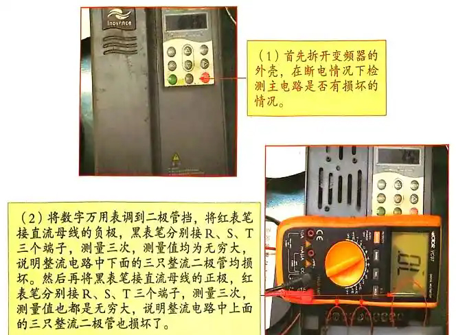 1.在进行通电检测之前,首要任务是利用万用表对整流电路和IGBT模块进行细致的检查,以确保它们的完好性,从而避免在通电过程中可能导致的变频器电路的进一步损坏。