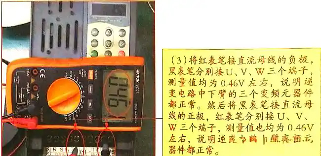 4.将红表笔与直流母线的负极相连,随后用黑表笔依次触及U、V、W三个端子,进行三次测量。若每次的测量值都接近0.46V,则可判定逆变电路中下臂的三只变频元器件均工作正常。