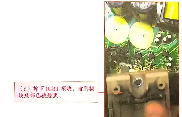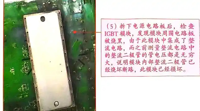 5.在拆下电源电路板进行进一步检查时,我们发现IGBT模块周围的电路板有烧黑的痕迹。由于IGBT模块中包含了整流电路,而先前测量整流电路中的整流二极管时,其管电压显示为无穷大,这表明模块内部的整流二极管已经烧坏并断路,因此可以判定该模块已损坏。