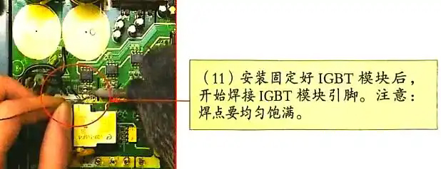 11.在确保IGBT模块已稳固安装的基础上,我们接下来进行引脚的焊接工作。此步骤需格外小心,确保焊点达到均匀且饱满的标准,以保证焊接质量。