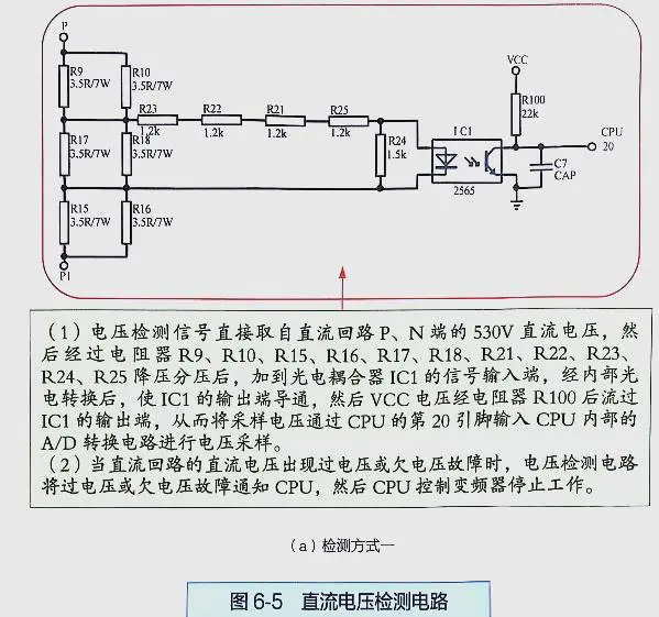 直流电压的检测在变频器中扮演着至关重要的角色,它直接关系到输出控制和各种保护功能的实现。这种检测方式通常有两种实现途径。直流电压检测在变频器中通过两种主要途径实现,一种是通过直接从直流母线上分压,并利用光电耦合器进行处理,随后将处理后的信号送入CPU内部的A/D电路进行采样,从而获得母线电压的精确值。这种方式在图中得到了应用。