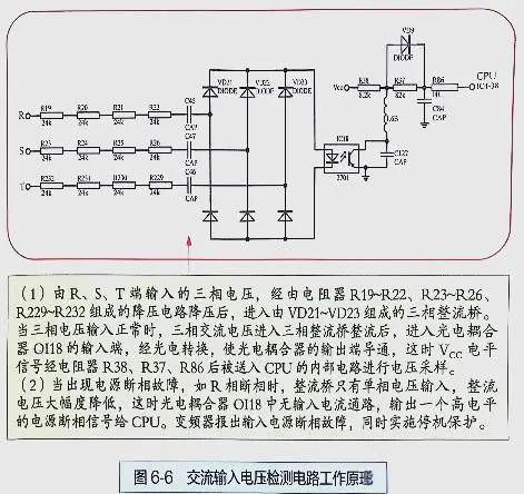 交流输入电压检测电路的核心任务是监测R、S、T端输入的电源电压。首先,这些电压会经过电阻器进行降压或限流处理,以确保电路的安全。随后,这些经过处理的电压会通过桥式整流电路进行整流,转化为脉动直流电压,利用光电耦合器进行处理,然后由CPU判断是否存在缺相情况,确保电路安全。其整个工作过程如图所示。