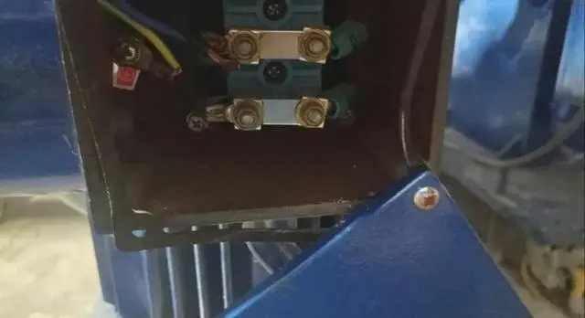 到现场去检查电机,刚拆开电机接线盖,就看到有一条黑色的线掉出来了,应该是他们拉扯这个电机移动了,所以就把线拉出来了,把这条黑色的线接上去,把线接好,把接线盖给盖上。