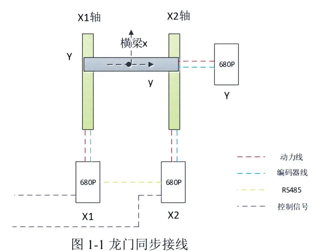 具体来说,X1轴应与X1驱动器相连,X2轴则与X2驱动器相连,而横梁轴则接至Y驱动器。通过485总线通讯,保持电机型号一致确保精确同步。 X1与X2驱动器之间通过485总线进行实时通讯,以确保数据的准确传输。同时,为了保持同步调试的精确性,X1轴与X2轴所连接的电机与驱动器型号必须保持一致。