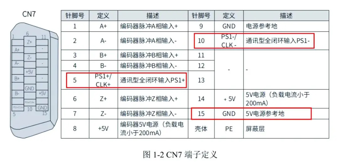 RS485 使用 CN7 端口, 需接引脚如下; X1 轴 CN7 端口 5 脚接 X2 轴 CN7 端口 5脚, X1 轴 CN7 端口 10 脚接 X2 轴 CN7 端口 10 脚, X1 轴 CN7 端口 15 脚接 X2 轴 CN7 端口 15 脚。 即连接两驱动器 CN7 端子的 PS1+、 PS1-与 GND,如下图所示。