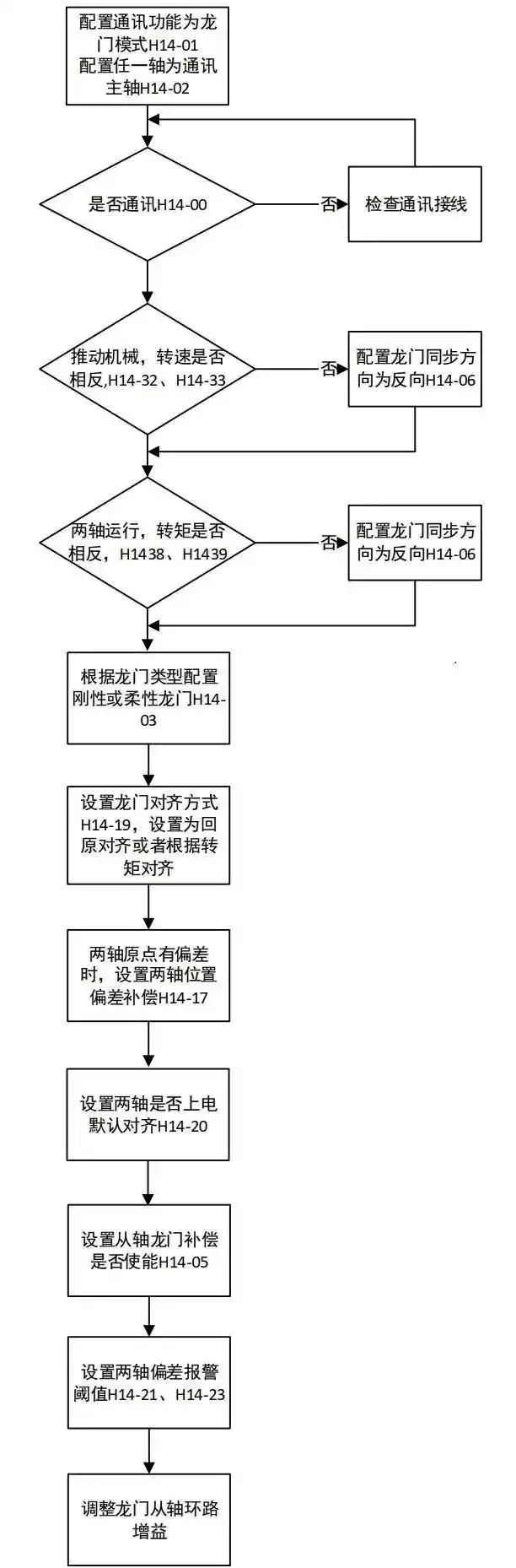 在龙门回原对齐时,需确保两轴设置相同的回原参数,并同时接受回零指令。确保两轴对齐完成且偏差补偿正确无误。 在对齐过程中,如若未启用位置偏差补偿H14-19,则表示龙门已成功回原。如果已启用偏差补偿,系统将自动调整补偿量以确保对齐的正确性。