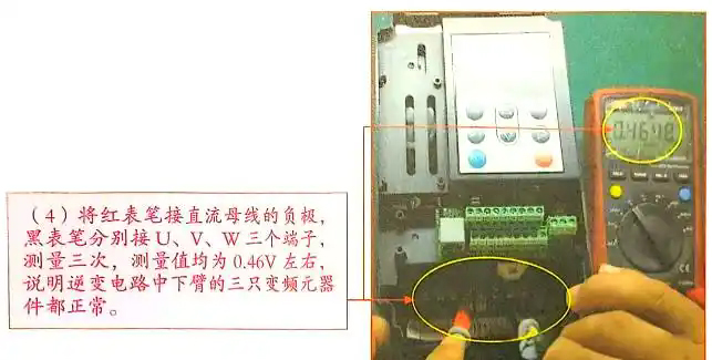 4.将红表笔与直流母线的负极相连,随后用黑表笔依次触及U、V、W三个端子,进行三次测量。若每次的测量值都接近0.46V,则可判定逆变电路中下臂的三只变频元器件均工作正常。
