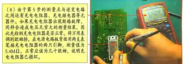 8.在进行主电路的进一步检查之前,我们首先需要排除与逆变电路相关的其他元件可能造成的影响。这包括检查充电电阻器和充电继电器等元器件。若充电电阻器出现断路故障,同样会导致电压测量结果呈现无穷大。因此,我们首先应检测充电电阻器的状态。将万用表切换至欧姆挡,并在电源电路板背面将两支表笔分别接至充电电阻器的两个引脚,测得其电阻值为5.4MΩ,而正常值应为几十欧姆。这表明充电电阻器已损坏,需要更换。