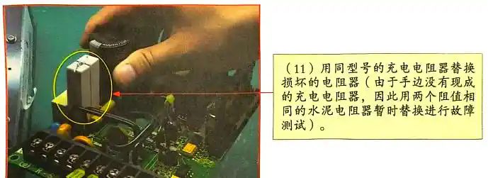 11.接着,我们用相同型号的充电电阻器替换了损坏的电阻器。由于目前手头没有现成的充电电阻器,我们暂时用两个阻值相同的水泥电阻器进行替换,以进行故障测试。