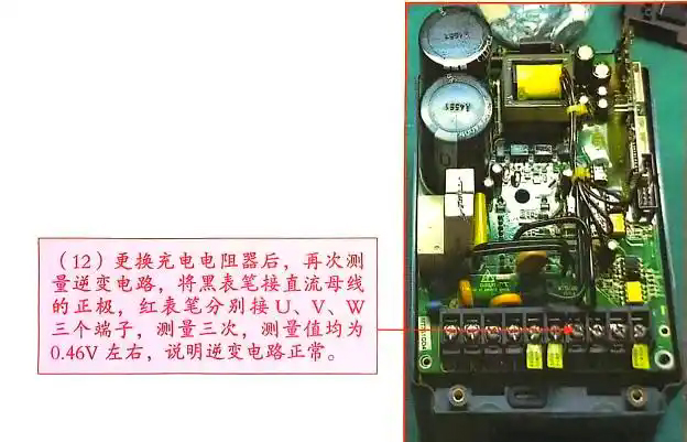 12.完成充电电阻器的替换后,我们重新对逆变电路进行了测量。在测量过程中,将万用表的黑表笔与直流母线的正极相连,红表笔则分别与U、V、W三个端子相接,进行了三次测量。每次的测量值都稳定在0.46V左右,这一结果指示逆变电路的工作状态良好。
