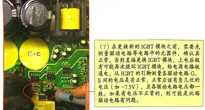 7.更换新的IGBT模块前,务必先对驱动电路等元器件进行测量,以确保其状态正常。若直接替换而未进行适当检查,上电后IGBT模块很可能再次受损。在给电源电路板通电后,应测量IGBT引脚处各驱动电路G、E间的电压,正常状态下应呈现负几伏的电压值(例如-7.5V),且各驱动电路的电压需保持一致。若发现电压异常,则可能指示该路驱动电路存在问题。