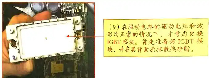 9.在确保驱动电路的驱动电压和波形均处于正常状态后,方可着手更换IGBT模块。在开始之前,需预先准备好IGBT模块,并在其背面均匀涂抹散热硅脂。