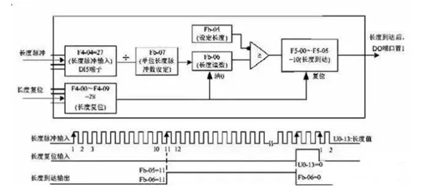 实际上它此时是利用变频器内部的PLC的计数功能实现的。如果是编码器转速低时,可以通过DI1、DI2、DI3输入长度检测传感器的脉冲信号。
