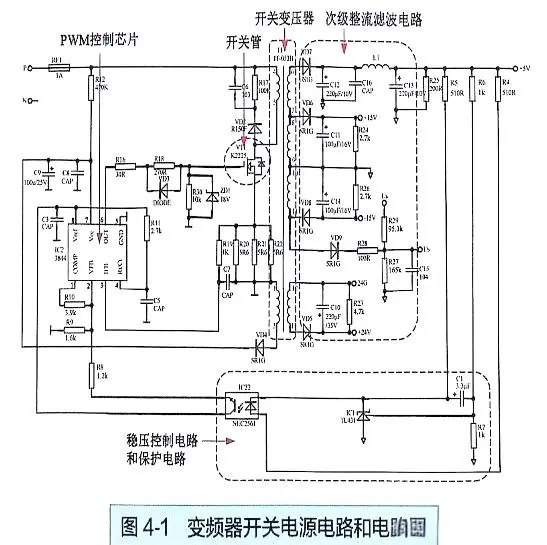 小功率变频器的开关电源电路,涵盖了多个关键组件,包括开关振荡电路、整流滤波电路、稳压控制电路以及保护电路等,共同构成了其完整的电路系统。这些部分协同工作,以提供稳定电压。